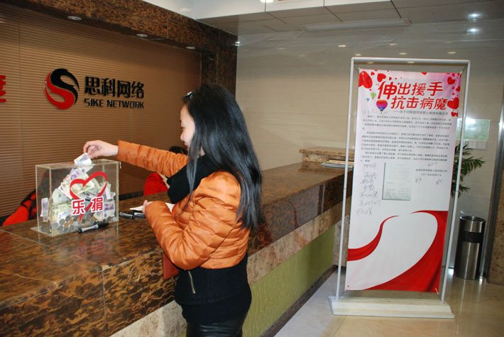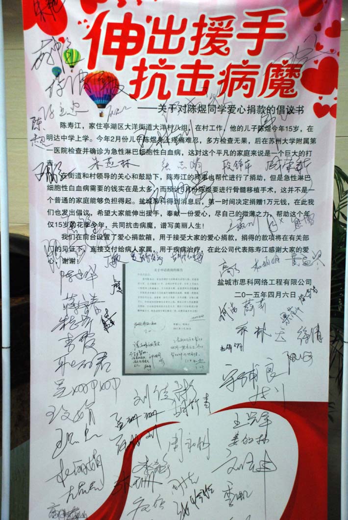 4月7日,在公司領(lǐng)導(dǎo)的關(guān)心和倡議下,鹽城思科全體員工發(fā)起了為陳煜同學愛心捐款的活動,大家都主動從自己的工資里拿出一百、五十、二十、十元……盡自己的微薄之力為陳煜同學獻上一份愛心,助其抗擊病魔,走出困境。